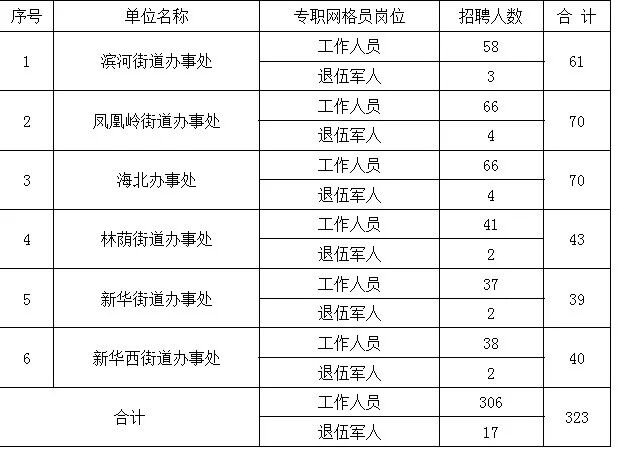 本次计划公开招聘专职网格员323人,其中:乌海市海勃湾区滨河街道办事处61人,凤凰岭街道办事处70人,海北街道办事处70人,林荫街道办事处43人,新华街道办事处39人,新华西街道办事处40人。每人只限报考一个岗位。